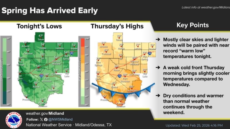 La misma masa de aire seco y cálido permanece y mantiene las temperaturas mínimas muy por encima de lo normal para finales de febrero, en torno a los 50 °F en la mayoría de los lugares, con algunos puntos que bajan hasta los 40 °F.